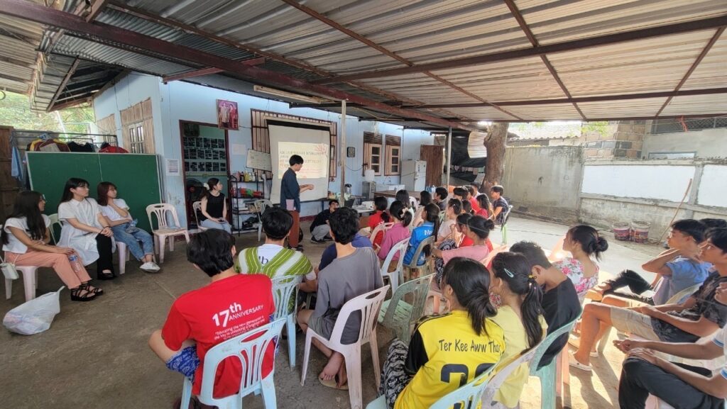 早朝にメーソート到着後、午前に1校、午後に2校の移民学校を訪問し「日本伝統文化体験」と「日本留学説明会」を開催しました。対象生徒は海外大学進学にむけてアメリカ高卒認定資格GED取得を目指しており、英語での会話が可能でした。「日本伝統文化体験」ではコマ、けん玉、お手玉を生徒と一緒に遊び、新鮮な体験にどの遊びも大きく盛り上がりをみせました。「日本留学フェア」は志も学力も高い中、政治的経済的障壁により大学進学が困難なこのような生徒の可能性を少しでも拡大したい思いから、日本に留学するためのステップ、条件、障壁に関する情報提供セッションを行いました。セッション後は生徒や先生と学業や将来について少人数班で話し、多くの生徒が日本留学に関心を示していることと彼らの現状の難しさを理解した上、今後のプロジェクト設計に向けて数々の知見を得ることできた濃密な1日でした。夜は実家がメーソットにあるメンバーの家に伺い、夕食をいただきました。