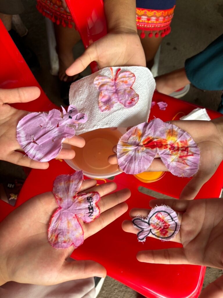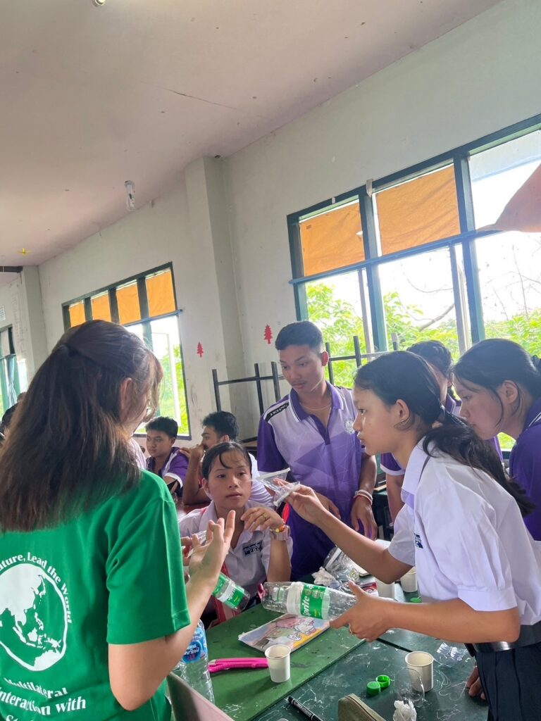 座学では分からない勉強の楽しさを実感してもらうという目的のもと、移民学校では普段行わない科学実験を行いました。ペットボトルロケット実験では、ロケットを実際に工作し、年齢を問わず楽しい雰囲気で過ごすことができました。最後に行ったチーム対決はとても盛り上がり、優勝チームのロケットが飛ぶと大きな歓声があがっていました。葡萄ジュースをお酢で布を染める実験では個性あふれる作品を作ることができました。メーソートの中でもエリート学校で行ったDNA析出実験は、座学で学んだ内容を踏まえた高度な議論が飛び交い、学生と有意義な学びの空間を過ごすことができました。