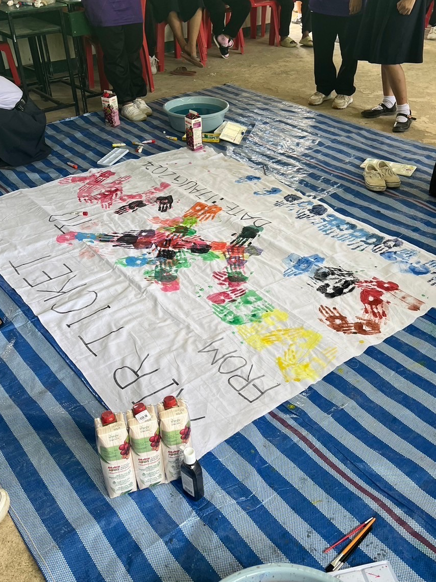 ミャンマー避難民の子供たちの存在と現状、日本とメーソートのつながりを象徴するような芸術作品を共同制作し、社会発信の題材にする。まず、思い思いに好きな色の絵の具を手に塗り広げ、搭乗券をイメージしたデザインの大きな布に手形を押し、巨大手形アートを作成しました。2枚作成したうちの1つは現地に寄贈し、思い出として残しました。また、実際に紙飛行機を折り紙で折る、「上を向いて歩こう」などの歌を歌った動画を撮影し、言語の壁を超えて生徒たちと楽しい時間を過ごすことができました。